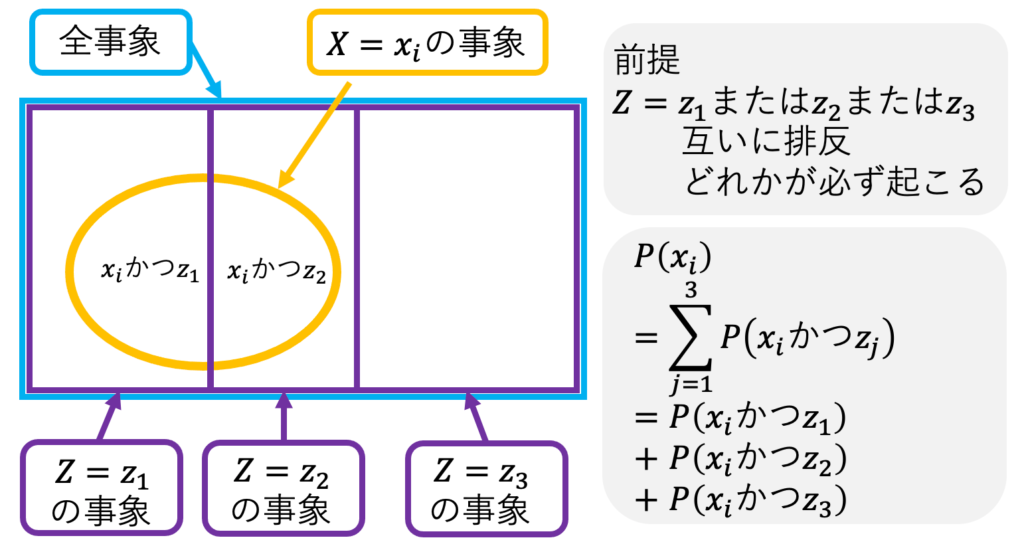 $$\sum_{j=1}^m P(yかつ x_j)=P(y)$$